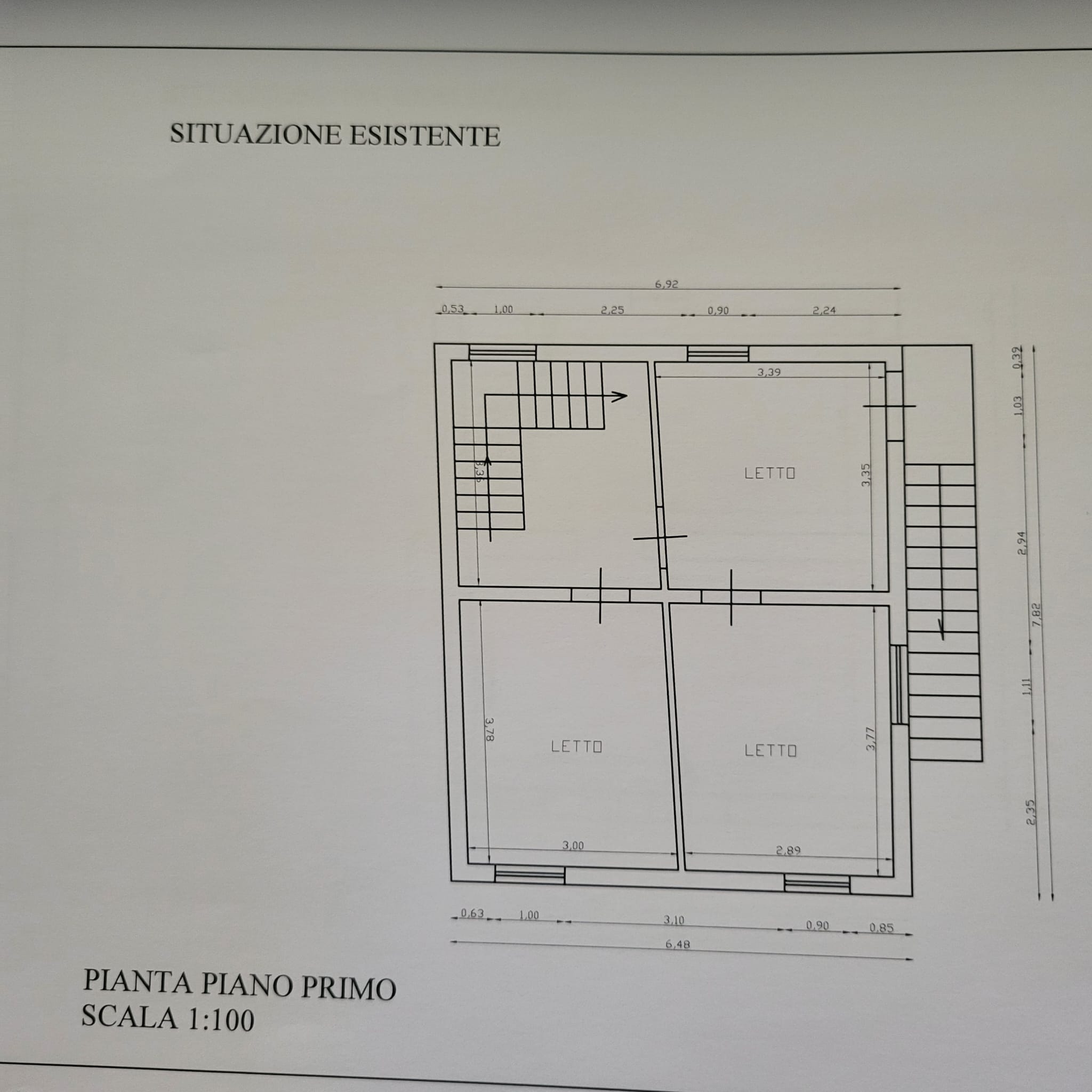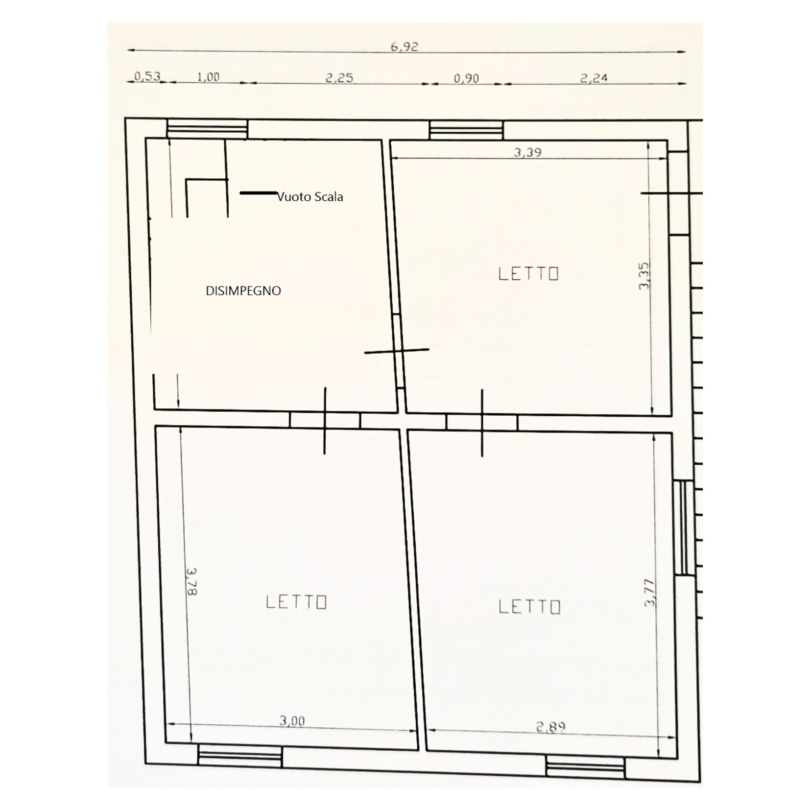 - Primo piano: tre ampie camere da letto e disimpegno, attualmente collegati tramite botola e scala in ferro, con possibilità di realizzare una scala definitiva.
