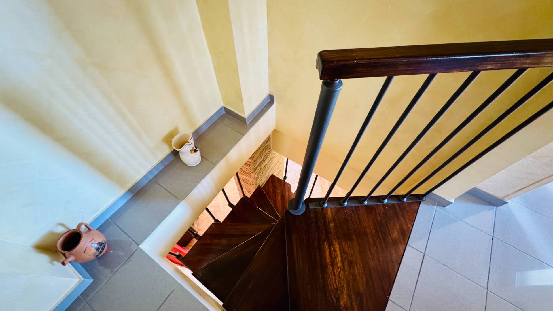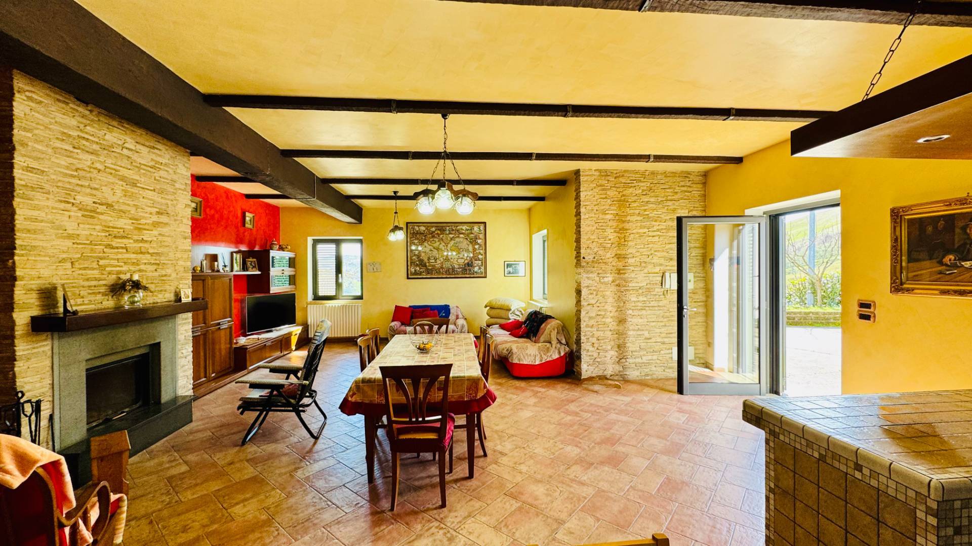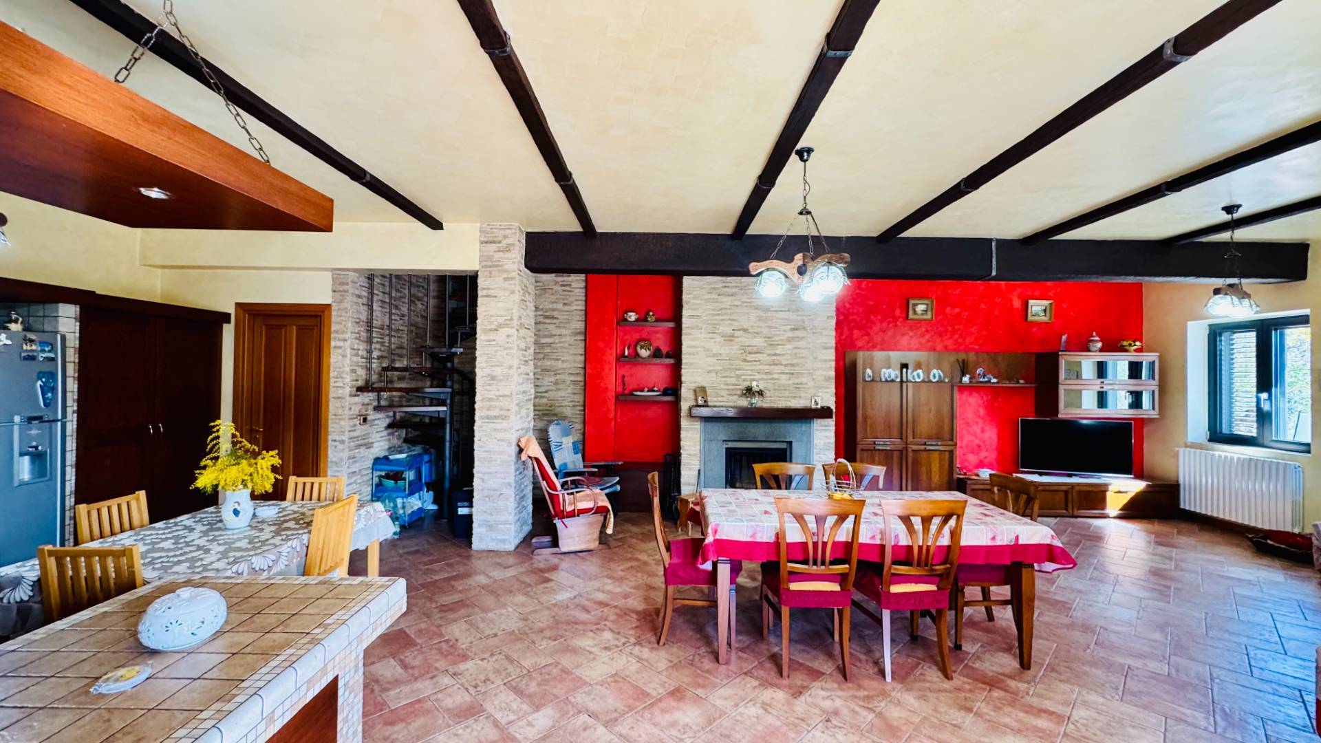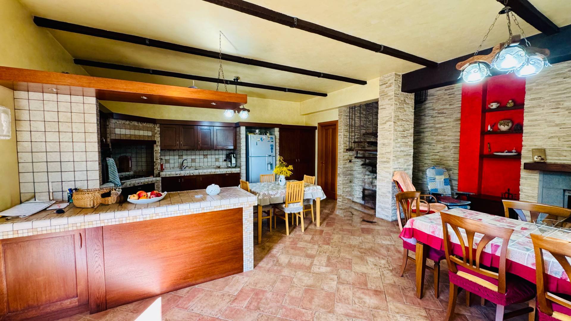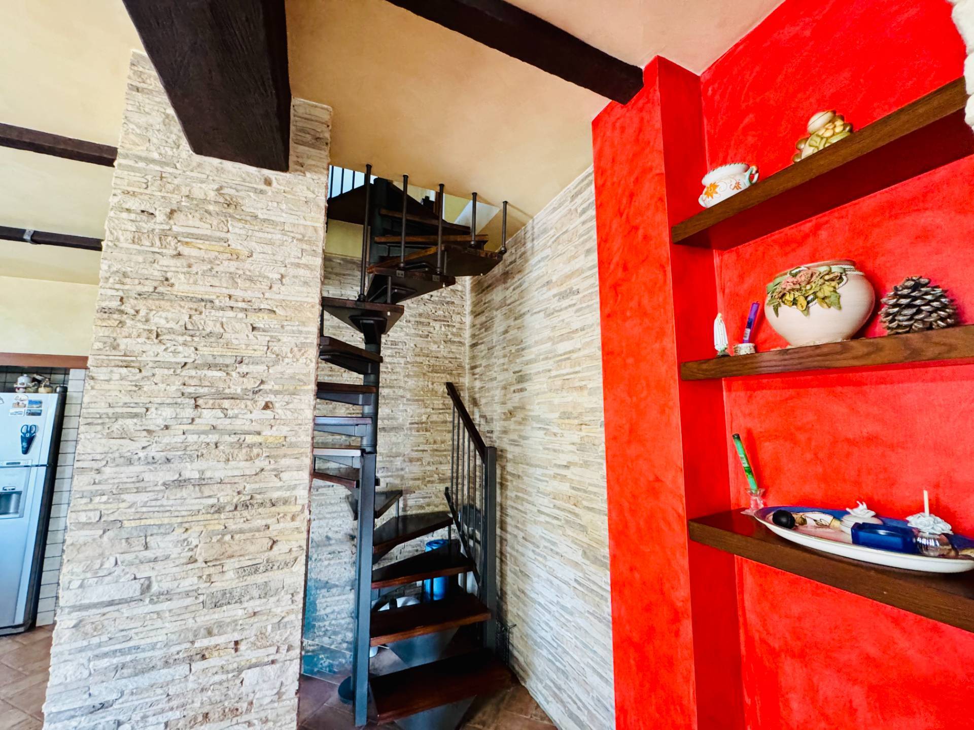 Il piano terra, collegato internamente da una suggestiva scala a chiocciola e dotato anche di ingresso indipendente, ospita una spaziosa tavernetta dall’atmosfera calda e accogliente, impreziosita da angolo cottura in muratura e termocamino. Completano il livello un bagno, un garage di 25 mq e una comoda cantina di 8 mq.